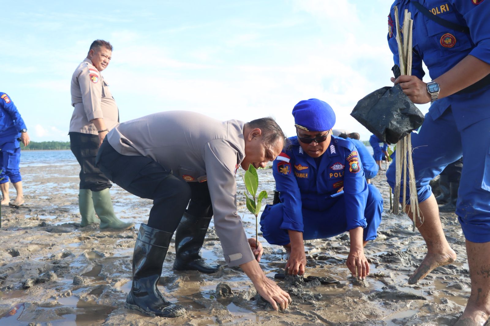 Dipimpin langsung oleh Wakapolres Natuna, Kompol Paten Tarigan, S.H., didampingi Kasatpolairud Iptu Ronal Tampubolon, para personel Polres, pejabat utama (PJU), serta Bhayangkari bergotong royong menanam ratusan bibit mangrove di kawasan rawan abrasi.