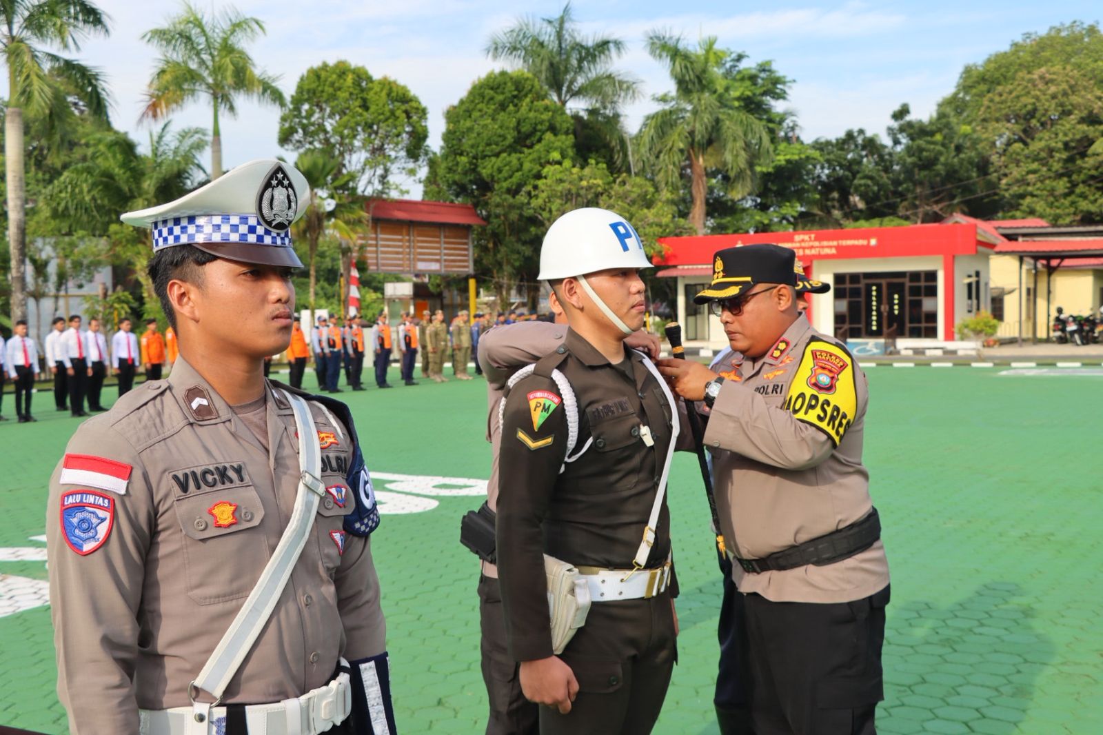 (Kapolres Natuna menyematkan tanda peserta operasi patuh Seligi 2025)