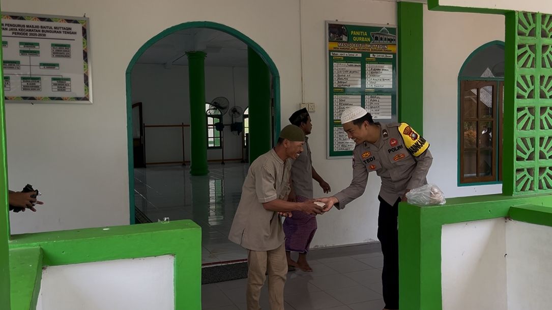 Tepat selepas salat Jumat, sekitar pukul 11.45 WIB, dua anggota polisi muda — Bripda Tedi Nugeraha Wardana dan Bripda Richard Jan Fredo Sembiring — berdiri di pelataran masjid. Di tangan mereka, puluhan nasi bungkus dibagikan satu per satu kepada para jemaah yang baru saja menunaikan ibadah.